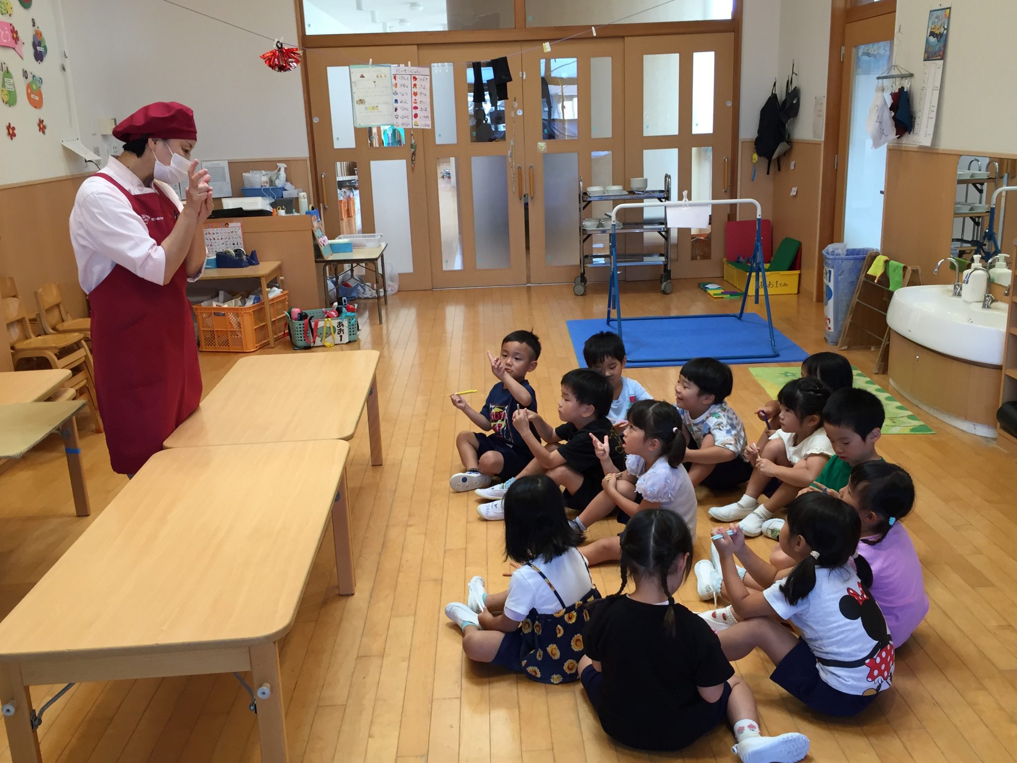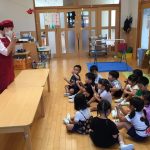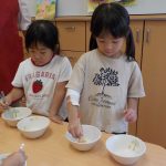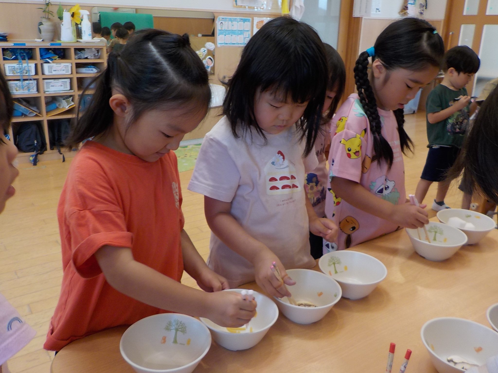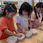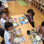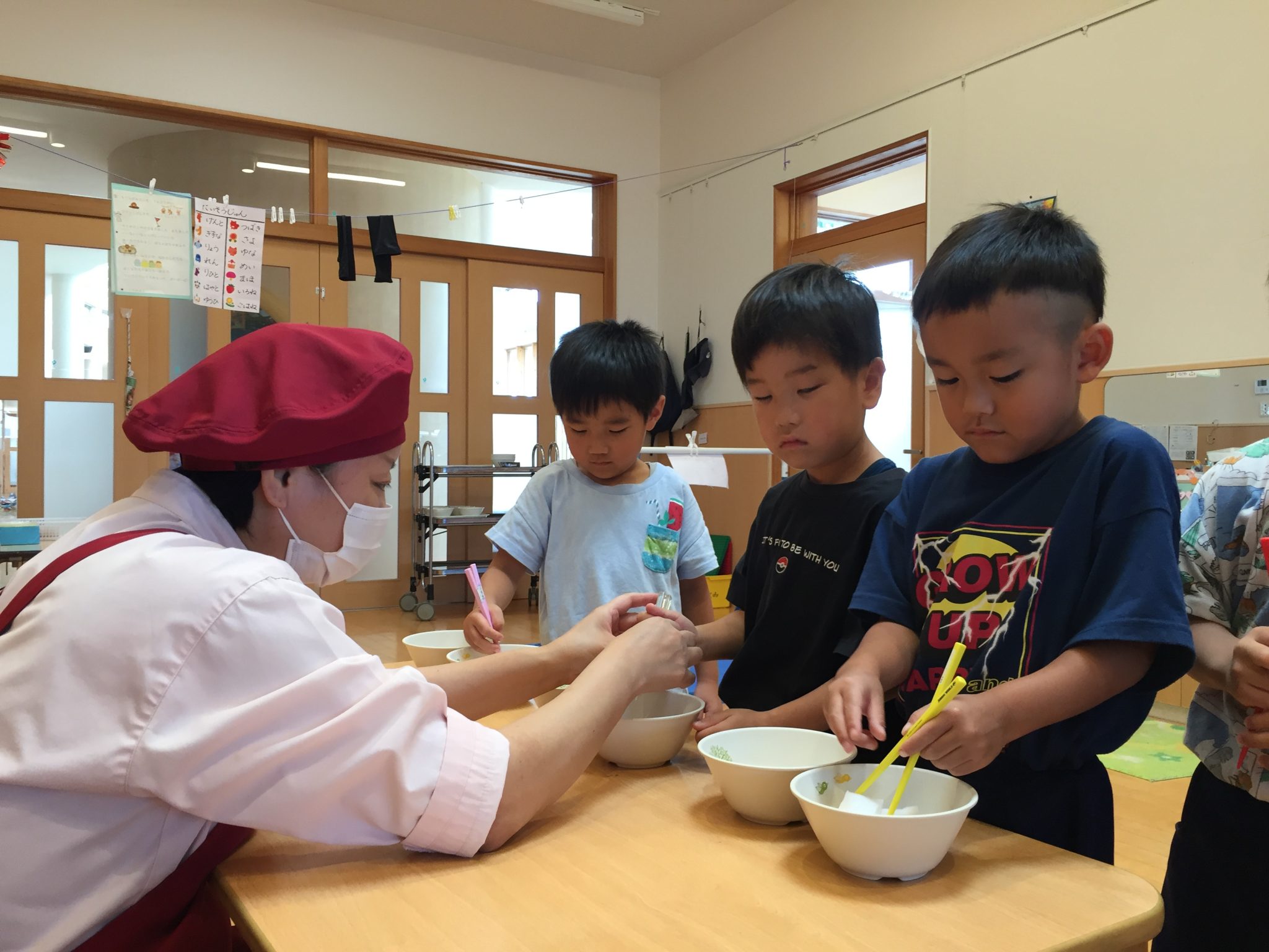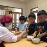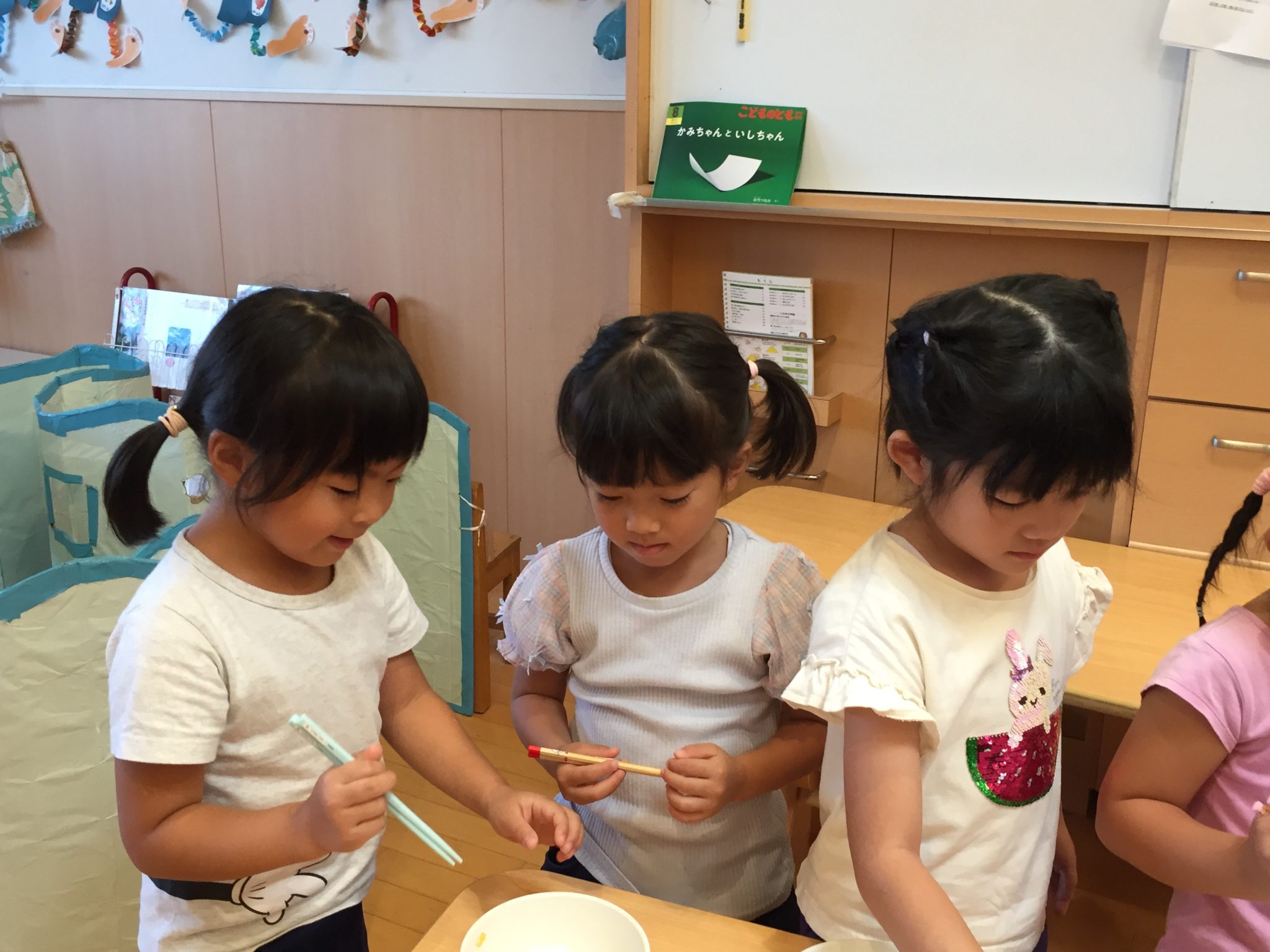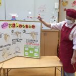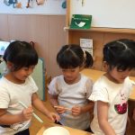 ミールケアさんからお箸の持ち方について教えてもらいました。3本の指を使って薬指、小指はお休みという事を知り、指に全集中して箸を動かしてみる子どもたち。集中して口も動いてしまう可愛らしい姿も見られました。実際に、スポンジや干ししいたけ、マカロニを使ってお箸の練習をしました。苦戦する子の姿もありましたが、掴めると「できた!」と嬉しそうでした。